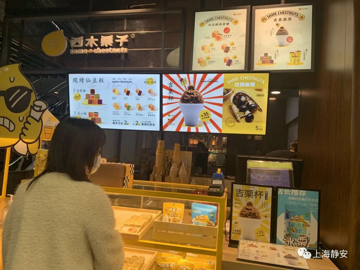 同样位于芮欧百货的“西木栗子”主打栗子相关产品,例如老树栗蓉口味的现烤仙豆糕,还有由栗子泥、栗子酱和冰激凌制作出的“吉栗杯”甜品。工作人员赖先生表示,秋冬买栗子的人多,这个季节也很适合吃栗子。