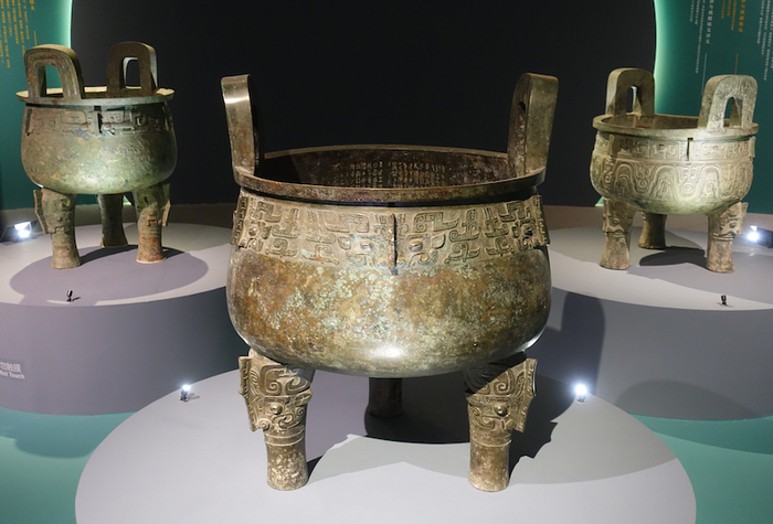 国博“礼和万方”展览中的大盂鼎子龙鼎与大克鼎(霍宏伟摄影)