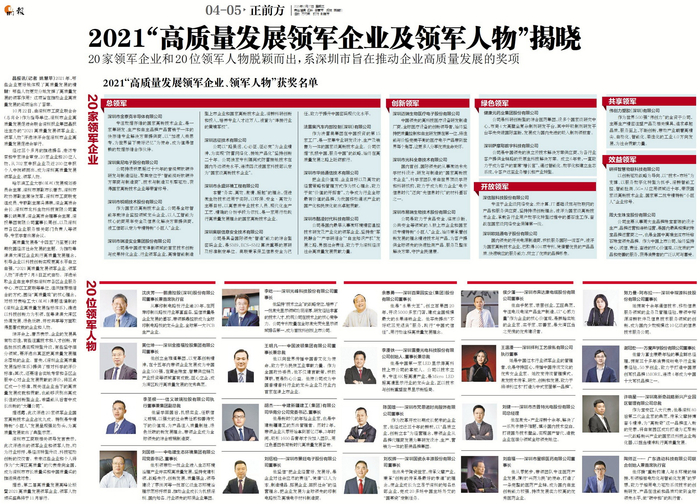 经过三个多月的推选提名、走访考察和专家综合审定,20家企业和20位人物,从702家申报企业及近200位申报个人中脱颖而出,成为深圳高质量发展领军企业、领军人物。