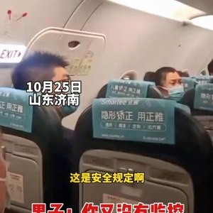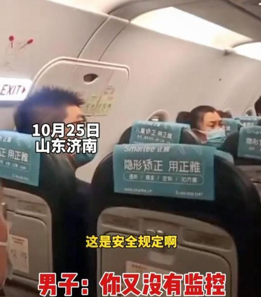 网曝视频显示:事发地点在济南机场,10月25日,春秋航空一航班即将从济南起飞抵达岳阳。一男子将手伸入航班安全门盖板遭到怒斥,乘务员称“我能这么激动吗?这是安全规定!”