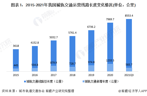 “十三五”期间,我国城市轨道交通新增运营里程4000公里,发展迅速,在满足人民群众交通出行、缓解城市交通拥堵、促进经济社会发展方面发挥了重要作用。已成为改善城市居民生活品质、提升人民群众获得感幸福感的重要载体。根据城市轨道交通协会数据,2020年,我国城轨交通运营线路长度为7969.7公里,其中地铁线路长度6280.8公里。截至2021年9月30日,我国城轨交通运行线路长度增长至8553.4公里,其中地铁线路长度6737.7公里。