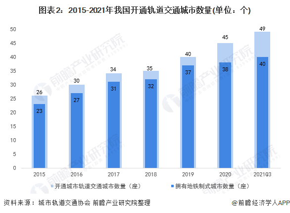 2015-2020年期间,我国开通城市轨道交通的城市由26座增长至45座城市。截至2021年9月30日,中国内地累计有49个城市投运城轨交通路线,其中40座城市在运营的轨道交通线路中拥有地铁制式。预计2021年下半年还将新增城轨交通运营城市1个,新增运营线路长度500公里左右。