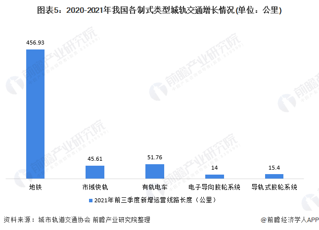 根据城市轨道交通协会统计数据显示,2021年前三季度新增583.70公里的城轨交通运营线路共涉及5种制式,其中,地铁456.93公里,市域快轨45.61公里、有轨电车51.76公里,电子导向胶轮系统14公里,导轨式胶轮系统15.40公里。