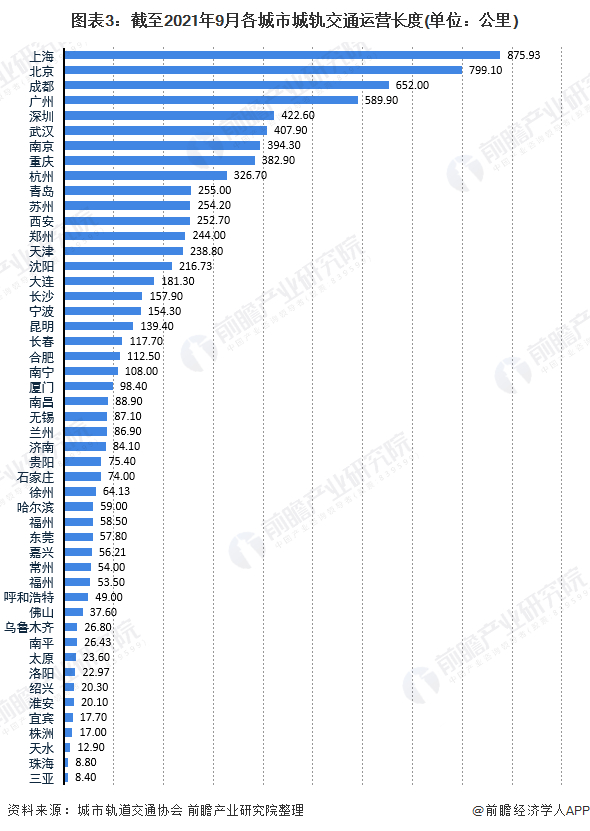 截至2021年9月30日,我国内地累计有49座城市城市轨道交通投运,其中上海、北京、成都、广州4座城市运营线路长度超过了500公里;深圳、武汉、南京、重庆、杭州、青岛、苏州、西安、郑州、天津、沈阳11座城市运营线路超过了200公里。2021年前三季度新增洛阳、嘉兴、绍兴、南平4座城市轨道交通运营城市,其中洛阳、绍兴为地铁运营城市。
