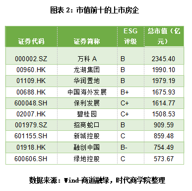 从市值看,截至10月25日,76家上市房企中,总市值超1000亿元的房企有6家,其中仅1家(中国海外发展)ESG评级为B+,有3家(万科A、龙湖集团、华润置地)ESG评级为B,有两家(保利发展、碧桂园)ESG评级为C+。总市值低于300亿元的房企有56家,其中ESG评级为B-级以下(含B-级)的房企有31家,如中国恒大、华夏幸福、蓝光发展均为B-级。