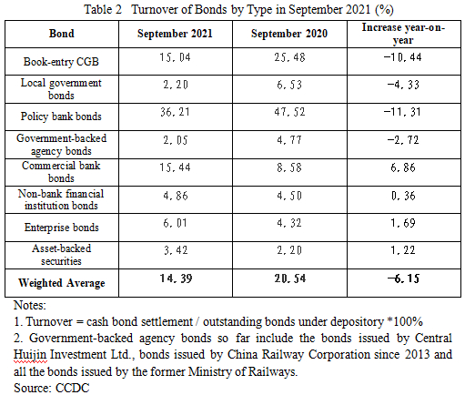 In September, CCDC recorded transaction and settlement of RMB 91.31 trillion, decreasing 0.36% year on year. Specifically, the transaction and settlement volume of cash bond was RMB 12.10 trillion, while that of repos was RMB 79.21 trillion. The most active trading parties for cash bonds registered at CCDC were commercial banks, securities firms and unincorporated products, with settlement value of RMB 11.45 trillion, RMB 8.22 trillion and RMB 3.33 trillion respectively. The average turnover registered at CCDC was 14.39% (Table 2). The active bonds were policy bank bonds, commercial bank bonds and book-entry CGB, with turnovers rate of 36.21%, 15.44% and 15.04% respectively.