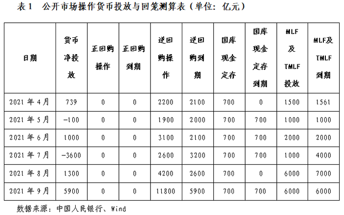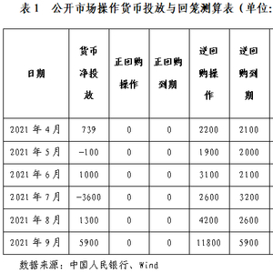 9月,货币政策工具操作实现资金净投放5900亿元(见表1)。中国人民银行通过逆回购操作投放11800亿元,通过国库现金定存投放700亿元,通过中期借贷便利(MLF)投放6000亿元;通过逆回购到期回笼5900亿元,通过国库现金定存到期回笼700亿元,通过MLF到期回笼6000亿元。