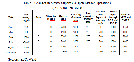 In September, a net amount of RMB 590 billion was release from the market by monetary policy tools (Table 1). The People’s Bank of China provided RMB 1180 billion through reverse repos, RMB 70 billion through deposits of treasury cash, RMB 600 billion through medium-term lending facility (MLF); while withdrawn RMB 590 billion through close leg of reverse repo, RMB 70 through deposits of treasury cash, RMB 600 billion through matured MLF.