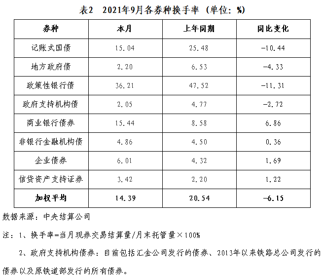 9月,中央结算公司办理交易结算91.31万亿元,同比减少0.36%。其中,现券交易结算量为12.10万亿元;回购交易结算量为79.21万亿元。现券结算量最大的三类机构为商业银行、证券公司和非法人产品,结算量分别为11.45万亿元、8.22万亿元、3.33万亿元。中央结算公司登记债券的换手率平均为14.39%(见表2)。其中,交易较活跃的债券为政策性银行债、商业银行债券和记账式国债,换手率分别为36.21%、15.44%和15.04%。