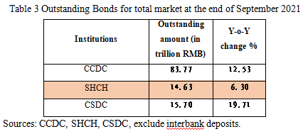 At the end of September, the CCDC’s total bonds outstanding volume were RMB 83.77 trillion, up 12.53% year on year. Those at SHCH reached RMB 14.63 trillion, up 6.30% year on year. Those at CSDC stood at RMB 15.70 trillion, up 19.71% year on year.