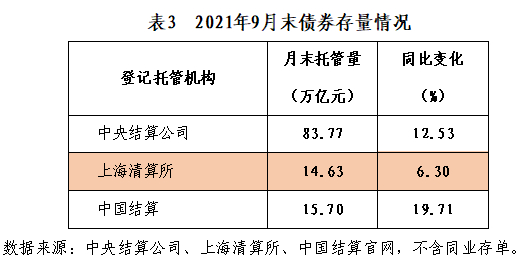 截至9月末,中央结算公司托管总量为83.77万亿元,同比增长12.53%;上海清算所托管总量为14.63万亿元,同比增长6.30%;中国结算托管总量为15.70万亿元,同比增长19.71%。