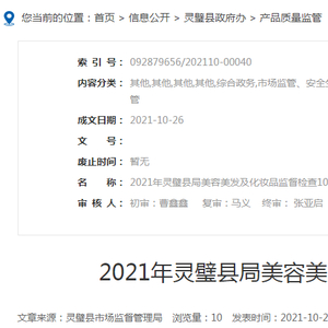 中国质量新闻网讯 2021年10月26日,安徽省灵璧县人民政府网站发布2021年美容美发及化妆品监督检查10月报表。本次