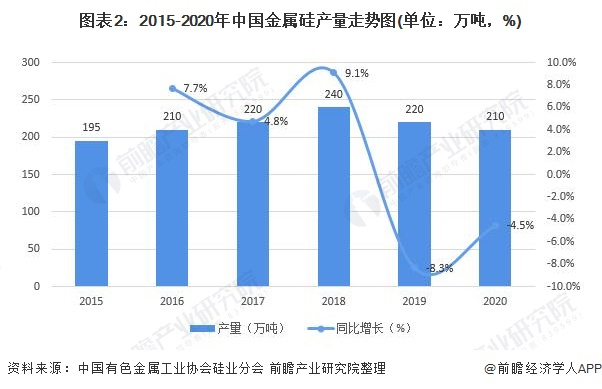 根据中国有色金属工业协会硅业分会公布的数据显示,2015-2018年我国金属硅产能持续释放,金属硅产量有所提升,但2019年由于价格持续低迷,高成本产能大规模关停,国内金属硅产量下降到了220万吨,相比2018年下降20万吨。2020年受疫情影响,国内金属硅产量再次下降,共为210万吨,同比下降4.5%。