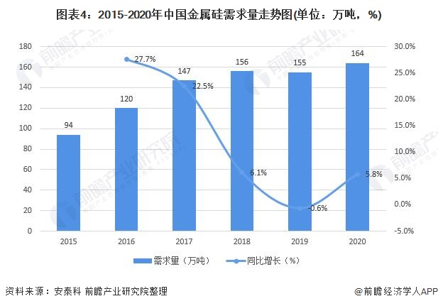 金属硅的下游应用已经渗透到国防军工、信息产业、新能源等相关行业中,在我国经济社会发展中具有特殊的地位,是新能源、新材料产业发展不可或缺的重要材料。根据中国有色金属工业协会硅业分会公布的数据显示,2015-2020年我国金属硅市场需求整体呈现增长趋势,2020年我国共有金属硅消费量164万吨,同比增长5.8%。