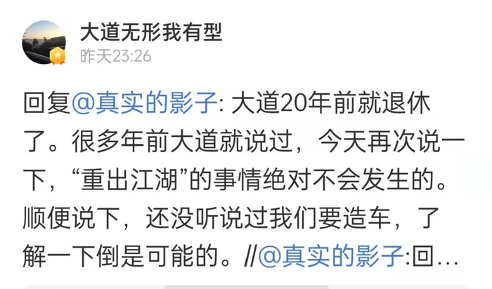 10月26日深夜,段永平在雪球账号“大道无形我有型”回应称:“大道20年前就退休了。很多年前大道就说过,今天再次说一下,‘重出江湖’的事情绝对不会发生的。顺便说下,还没听说过我们要造车,了解一下倒是可能的。”
