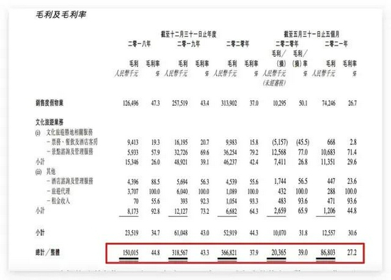 在销售物业营收占比持续扩大的同时,中国文旅的毛利率却在下滑。2018年-2021年前5个月,中国文旅毛利率为44.8%、43.3%、37.9%、27.2%。其中,销售度假物业毛利率为47.3%、43.4%、37.0%及26.7%;文化旅游业务的毛利率为34.7%、43.0%、44.3%及30.6%。