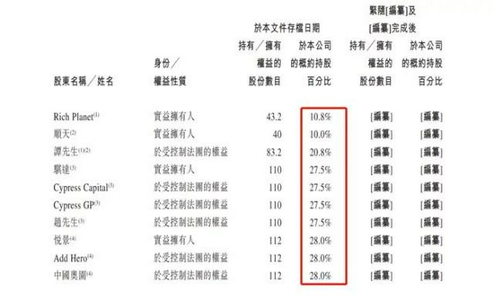 从股权结构来看,中国文旅的第一大股东为持股30%的Rich Planet;中国奥园(3383 .HK)通过悦景持有其28%股权;赵文炜、谭嘉伟、林锦堂通过旗下公司分别持股27.5%、10%、4.5%。