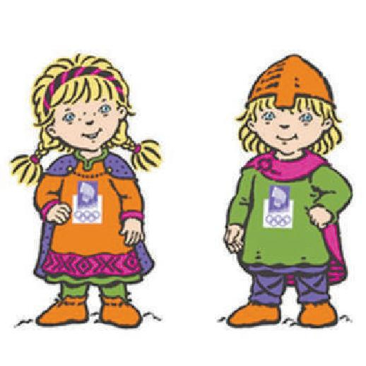 男孩的名字叫Haakon(哈可恩),女孩的名字叫Kristin(克丽斯蒂恩)。两个孩子身穿中世纪服装,并肩坐在一起,脚尖往上翘着,目光炯炯地注视着前方,嘴上挂着微笑,显得十分开朗自信。其寓意是鼓励运动员和世界各国的人民相亲相爱,让世界更加美好。