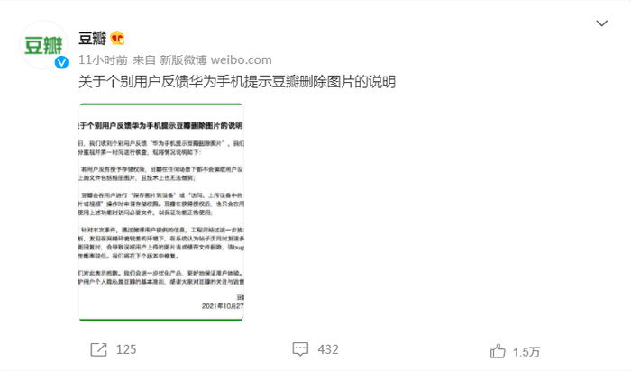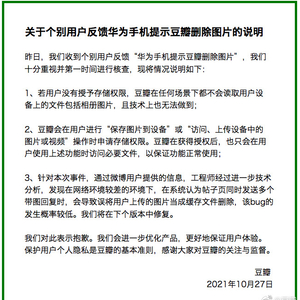 豆瓣在声明中表示,收到个别用户反馈“华为手机提示豆瓣删除图片”,十分重视,并第一时间进行核查。