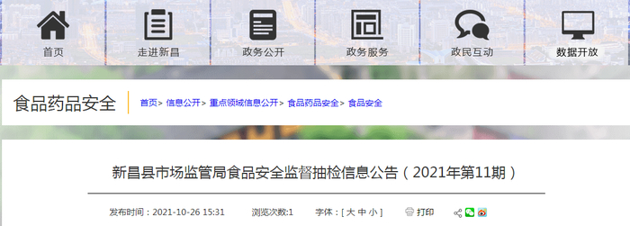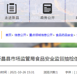 原标题:浙江省新昌县市场监管局抽检105批次食品 1批次不合格