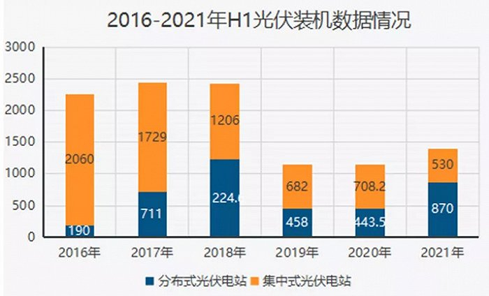 2021年上半年,我国新增光伏装机规模14.1GW,同比增长22.6%。其中集中式光伏新增装机规模同比下降24.2%,分布式光伏装机规模同比增加97.5%,分布式光伏装机量首次超越集中式光伏。