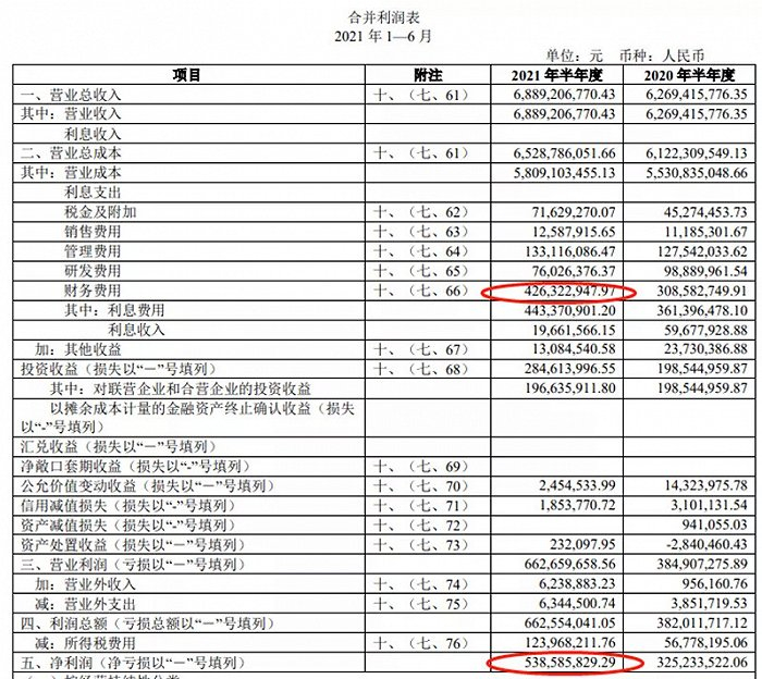 较大的贷款产生了高昂的利息费用,仅上半年财务费用高达4.26亿,而当期的净利润不过5.38亿。