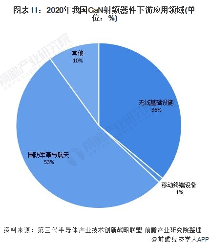 国防军事与航天应用是我国GaN微波射频器件的主要应用领域,2020年市场规模占整个GaN射频器件市场的53%;其次是无线基础设施,下游市场占比为36%。