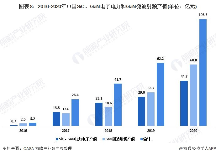 在国内大半导体产业增长乏力的大背景下,我国第三代半导体产业实现逆势增长。根据CASA的统计,2020年我国SiC、GaN电子电力和GaN微波射频产值合计达到105.5亿元,同比增长69.61%。