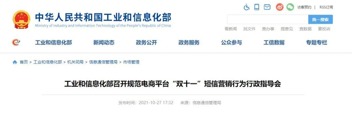 10月25日,工业和信息化部召开行政指导会,规范电商平台“双十一”短信营销行为。要求电商平台要立即全面自查自纠零售、金融等相关产品的短信营销行为,不得未经消费者同意或请求擅自发送营销短信,完善现有短信营销预案,及时向行业主管部门报告阶段工作进展情况。