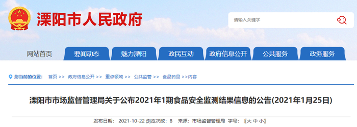中国质量新闻网讯 近日,江苏省溧阳市人民政府网站发布《溧阳市市场监督管理局关于公布2021年1期食品安全监测结果信息的公告(2021年1月25日)》。据公告,溧阳市市场监督管理局抽检包括食用农产品、方便食品、罐头、肉制品、水产制品等5大类食品86批次样品,抽样检验项目全部合格。