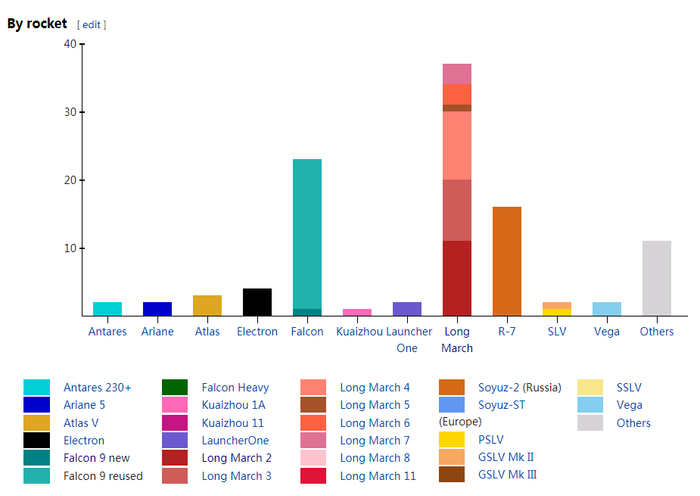 从火箭型号来看,中国长征系列火箭的发射次数最多,达到36次,美国SpaceX公司的“猎鹰9”系列火箭紧随其后,为23次。但如果从单一型号而言,美国重复使用的“猎鹰9”火箭以22次的发射纪录居于首位。