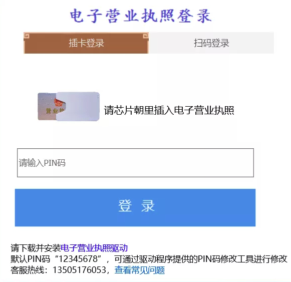 若选择插卡登录,插入卡片式电子营业执照(联系市场监管部门办理)或手机端微信、支付宝小程序扫码下载电子营业执照后,输入PIN码(默认密码:12345678)进行登录,如图。登录后将自动转入本企业档案查询系统。