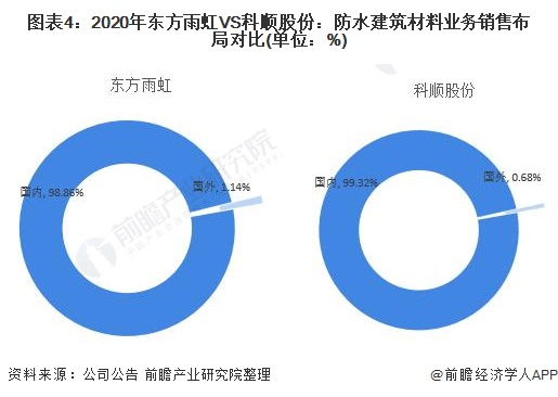 从两家公司的销售布局来看,2020年,东方雨虹的国内防水建筑材料业务营收占公司总营收的98.86%,国外业务营收占比仅为1.14%;科顺股份的国内防水建筑材料业务营收占公司总营收的99.32%,国外业务营收占比为0.68%。