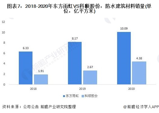 从防水建筑材料产品的销量来看,2018-2020年,两家公司的防水建筑材料销量整体上升,其中东方雨虹的防水建筑材料销量由6.33亿平方米增长至10.09亿平方米,科顺股份的销量由1.91亿平方米增长至4.38亿平方米。