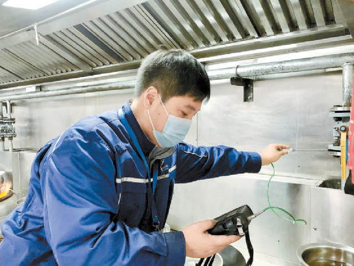 “先给您家进行一下环境检测。”张陶举起可燃气体检测仪,将吸气金属管伸到厨房吊顶附近,观察显示屏上是否有异常提醒。