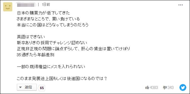 还有日本网民悲观表示,日本不仅是购买力下降,更是全方位皆输,且又不愿意对一些既得利益者动刀,“这样下去(日本)会不会变成发展中国家或落后国家?”
