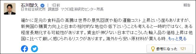 也有担任日本综合研究所调查部宏观经济研究中心所长的网民分析称,诚然,日本食品价格暴涨的原因包括全球经济复苏和航运成本上升,但考虑到新兴国家购买力的提高和日本相对地位的下降,这在一定程度上或将是长久状态。该网民还指称,在工资没有增长的日本,这种进口商品的价格上涨与其他国家相比,可能导致更严重的风险。日本从海外购买廉价原料的时代可能正在结束。