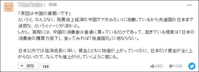 不过,对于“テレ東BIZ”的这番“怪中国”论调,许多日本网民根本不买账。有网民就针对报道标题讽刺称,“‘原因是中国的爆买’,这样说总让人觉得是发展中国家中国像傻瓜一样消费,连发达国家日本都觉得麻烦。但实际上,中国的消费者只是在正常购买,正在发生的现象是‘日本消费者的购买力下降’,换言之就是‘落后国家化’”。