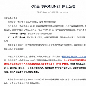10月28日,《极品飞车ONLINE》运营团队发布公告称,由于腾讯与《极品飞车ONLINE》游戏开发商的代理协议即将到期,经与开发商友好协商,腾讯将于2022年1月27日11点正式停止《极品飞车ONLINE》在中国大陆地区的运营。