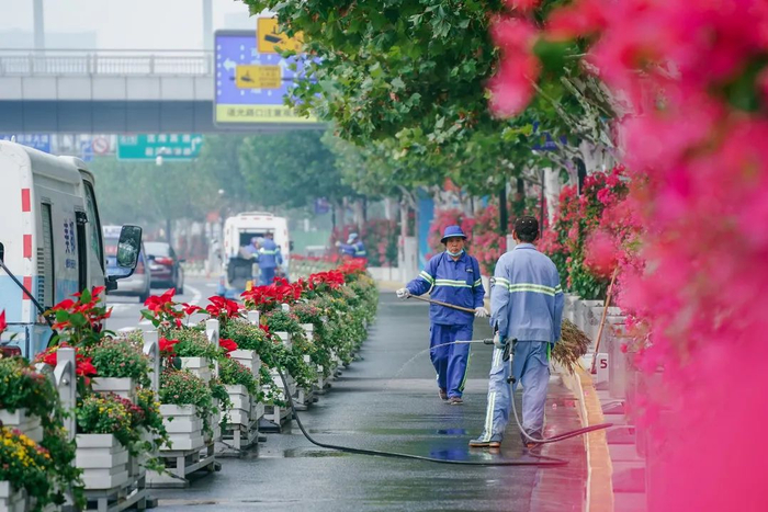 进博会期间,不只有国家会展中心(上海)鲜花怒放、绿意盎然。国家会展中心(上海)外围核心区的诸光路、盈港东路、涞港路、崧泽大道、会卓路、徐民路东段等重点道路绿化工作者们也已完成地面草花种植6690平方米,主要品种为大花百日草和一串红,布置花箱921组,主要品种为一品红;布置花墙、绿墙共计700平方米。