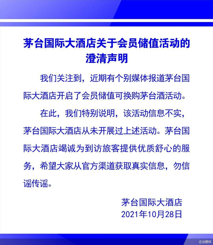 值得注意的是,网传新规“问世”不到24小时,便被茅台国际大酒店一则澄清声明神反转。据澄清声明显示,茅台国际大酒店开启会员储值可换购茅台酒活动信息不实,且从未开展过上述活动。