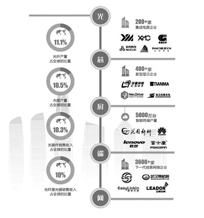 [ 追光逐芯三十余载,光谷诞生了全国第一根光纤、国内最大功率光纤激光器、全球首款128层三维闪存芯片等系列重大前沿科技成果。光谷已聚集光电子信息企业1000余家,培育了全球最大的光纤光缆研发生产基地、全国最大的光电器件和设备研发生产基地、全国规模最大且技术最先进的中小尺寸显示面板基地,成为代表我国光电子信息产业参与全球竞争的重要名片。 ]