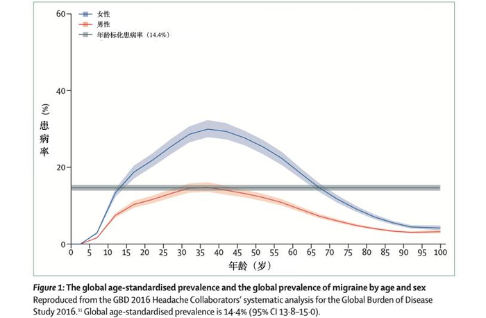2016 年全球疾病负担研究显示,在所有可能导致育龄期 (15~49 岁)女性失能的疾病中,偏头痛排名第一。