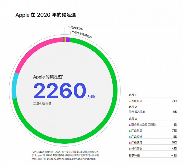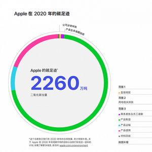苹果整个价值链的排放模型纳入了公司运营和完整的产品生命周期,包括制造、运输、使用以及设备的回收利用所产生的排放。2020年,Apple产生了2260万吨二氧化碳当量。下图中,“范围1”Apple拥有的或运营的排放源,如各种车辆、供暖所燃烧的天然气等所产生的温室气体;“范围2”指用电产生的温室气体;“范围3”包括了上游和下游活动的公司价值链中产生的其他所有间接排放。