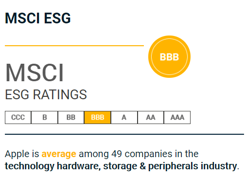 MSCI官网显示,苹果的ESG评级为BBB级,在49家同业公司中位于平均水平。