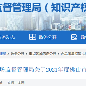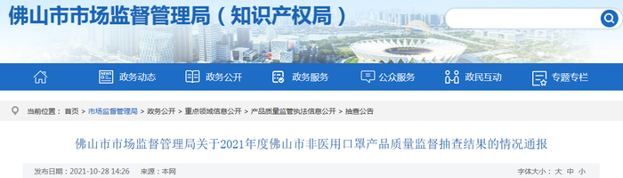 中国质量新闻网讯 2021年10月28日,广东省佛山市市场监督管理局网站发布关于2021年度佛山市非医用口罩产品质量监督抽查结果的情况通报 。