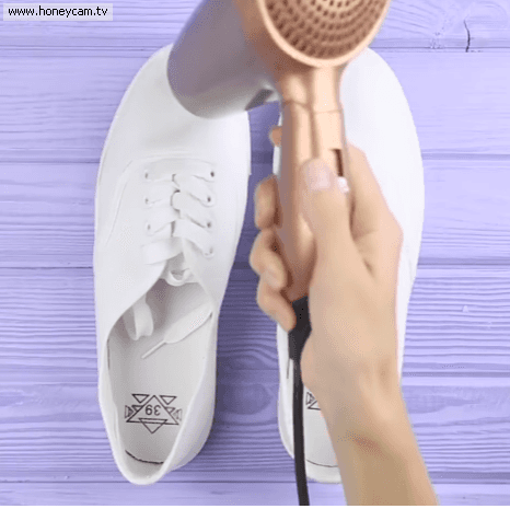 然后用吹风机加热上面的蜡,让它均匀的分布在小白鞋上,变得完整平滑。之后无论撒上多少水和脏东西,都不怕啦!