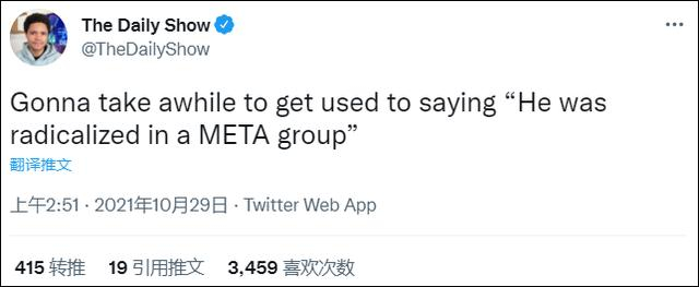 美国知名脱口秀主持人特雷弗·诺亚吐槽道:“我需要一段时间才能习惯说‘他在一个META团体中变激进了’。”(注:同音词metta有慈爱之意)