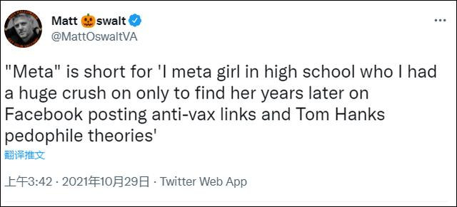 喜剧作家马特·奥斯瓦尔特(Matt Oswalt)在推特上写道:“Meta是‘我高中时超爱的一个女孩,但多年后发现她在Facebook上发布反疫苗链接和宣扬汤姆汉克斯是恋童癖”的缩写。”