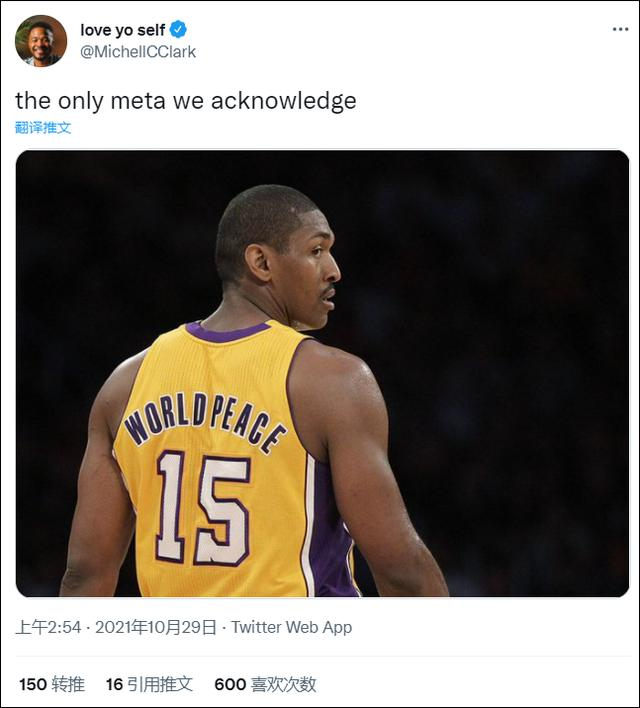 作家米切尔·克拉克(Mitchell Clark)晒出NBA球员Metta World Peace(慈世平,原名罗恩·阿泰斯特)的照片,笑称“这是我们唯一承认的‘梅塔’。”